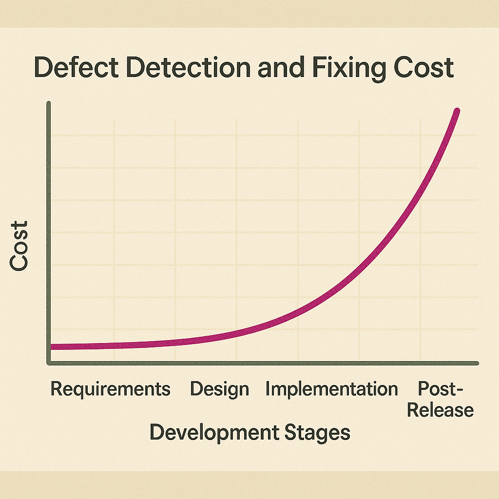 개발 초기 단계(요구사항 분석, 설계)에서 결함을 발견하면 수정 비용이 훨씬 저렴합니다.